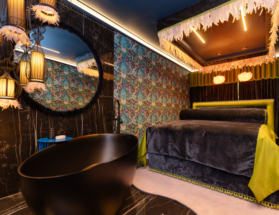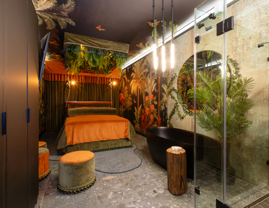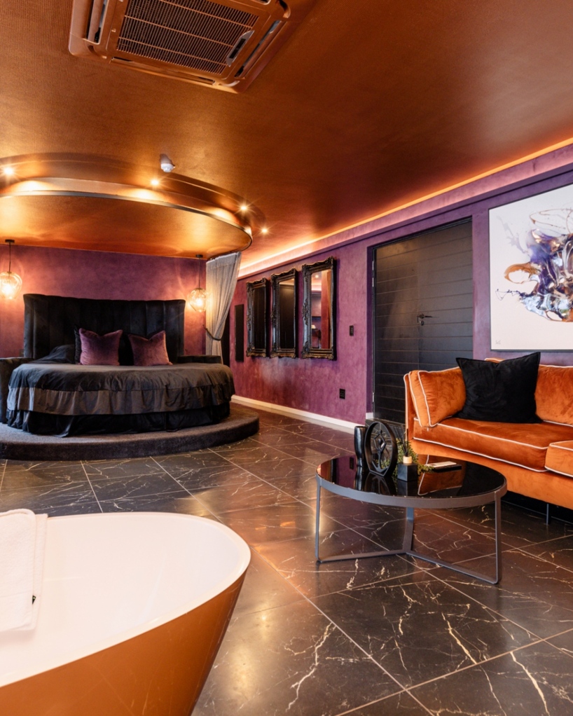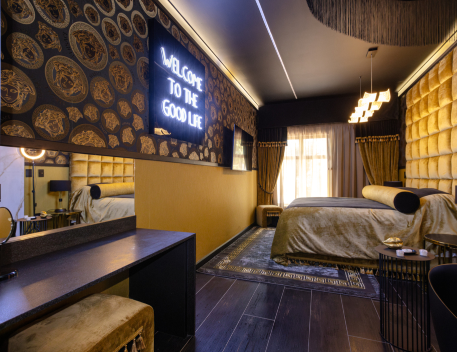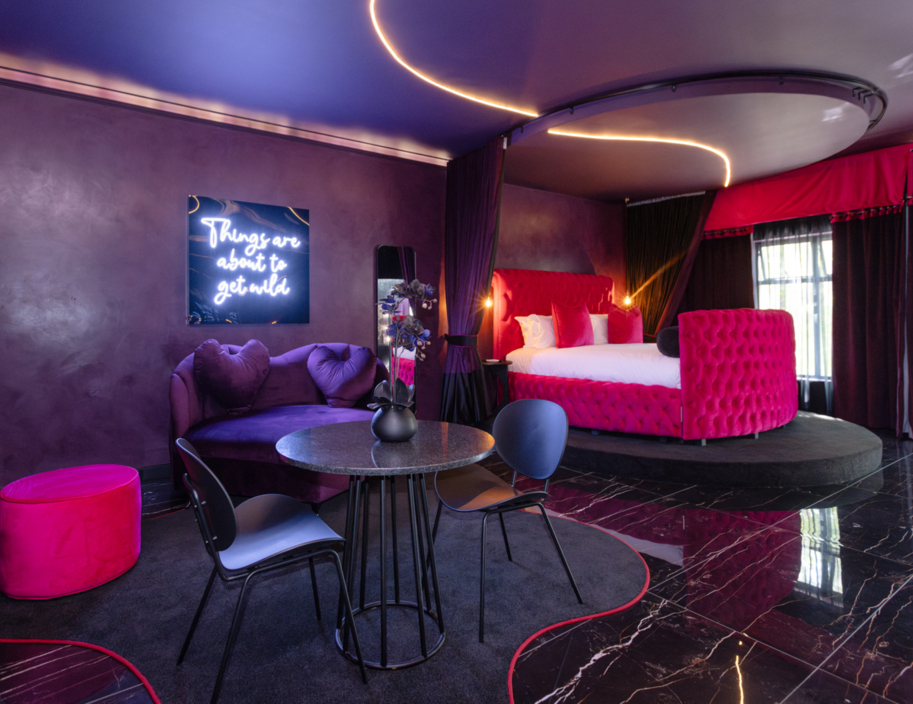 Prepare yourself for an unparalleled romantic retreat, exclusively design for you and bae. Whether it's for date night, your honeymoon, or an evening of kiss & make-up, our distinctive suite offers the ideal ambiance. The suite's interior design and décor are meticulously planned to provide you and bae with an unforgettable romantic experience. This Suite boasts a private courtyard garden, a dining area with a kitchenette, a luxurious velvet-covered sofa, an exceptional extra-large round bed, and an opulent en-suite bathroom with a walk-in shower. Access to a Butler, is also available, at your disposal 24/7. This suite is a true #OneOfaKind Suite!