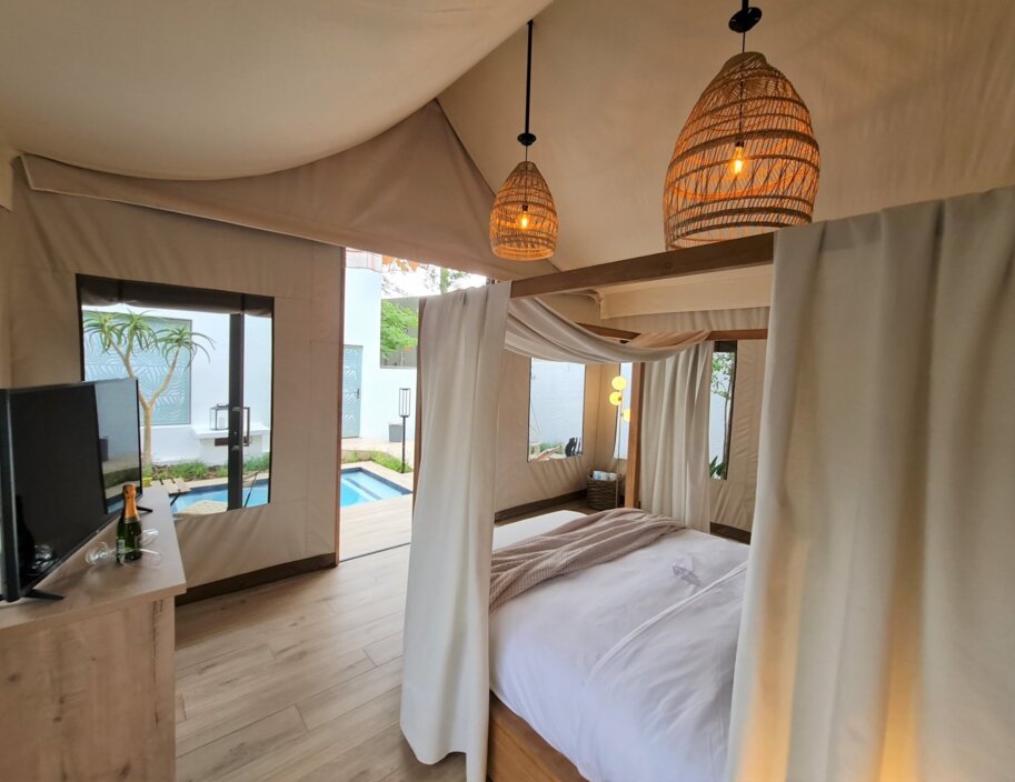 Step out into the African Sun like never before, and stay in a one-of-a-kind camping Suite located in the heart of Sandton. This suite features a spacious king bed adorned with opulent Egyptian cotton linen with an en-suite bathroom that includes both indoor and outdoor showers, providing a true bushveld feel. This luxurious tented Suite also offers superb outdoor living whilst enjoying luxurious amenities, such as a private firepit, splash pool, a BBQ facility and access to a Butler at your disposal 24/7.